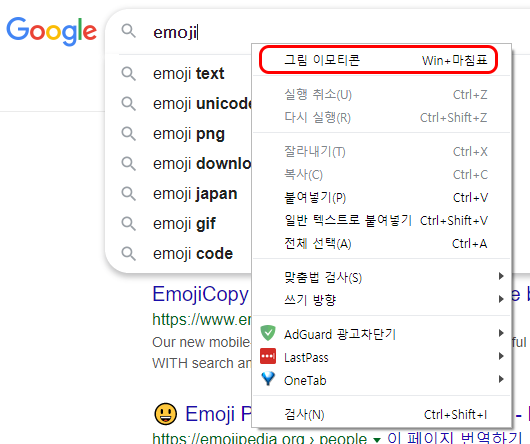 단축키는 윈도우 키(Windows Key) + 마침표(.) 또는 윈도우 키(Windows Key) + 세미콜론(;) 이라고 한다.