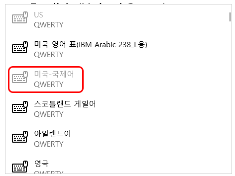 여러가지 키보드가 나올텐데 여기서 미국-국제어(US-International) 키보드를 추가한다. 나는 이미 국제어 입력기를 추가한 상태라 회색으로 나온다.