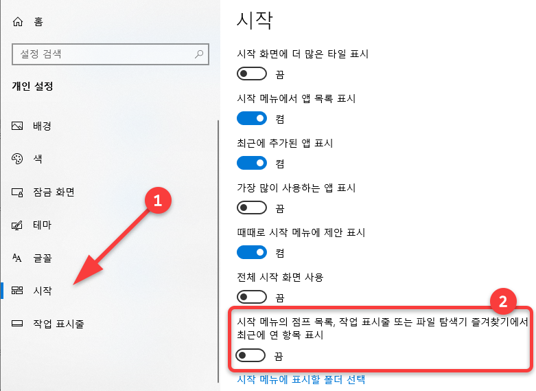 3) 시작 탭 - '시작 메뉴의 점프 목록, 작업 표시줄 또는 파일 탐색기 즐겨찾기에서 최근에 연 항목 표시'를 끔 상태로 변경