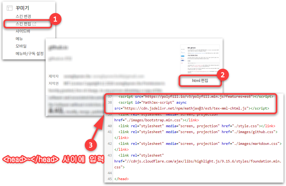 (3) 티스토리 스킨 편집 - HTML 편집에서 head 태그 안에 위에서 복사한 스크립트를 복사한다.