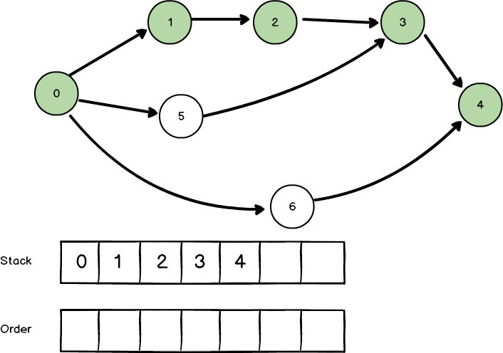 0 -> 1 -> 2 -> 3 -> 4까지 진행합니다. 4번 노드의 다음 노드가 없으니 order에 추가하고 종료합니다.
