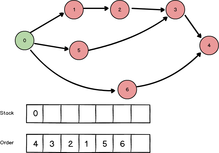 0번 노드로 다시 돌아와서 방문하지 않은 다음 노드가 없으니 order에 추가하고 종료합니다