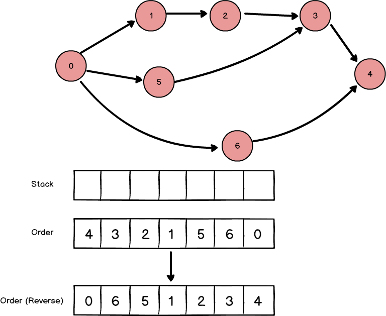 모든 노드를 방문했습니다. order를 뒤집으면 위상정렬한 순서가 됩니다. 처음부터 order의 앞에 추가할 수도 있지만, 배열의 맨 앞에 추가하는 연산은 비효율적이기 때문에 마지막에 한꺼번에 뒤집었습니다.