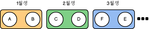 Fig 2.처럼 학교에서 생일 월이 같은 사람끼리의 집합들을 만들려고 합니다. 이를 표현하기 위해서는 각 사람을 0부터 n-1의 원소로 나타낸 뒤, 각 1개의 원소를 포함하는 n개의 집합을 만듭니다. 두 사람 a와 b의 생일 월이 같다는 게 확인되면 두 사람이 포함된 집합을 합칩니다.