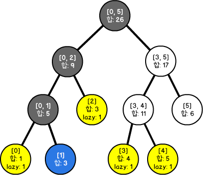 업데이트 한 노드의 자식 노드의 업데이트는 나중에 필요할 때 하기로 하고, 그 값을 lazy[i]에 적어둡니다.