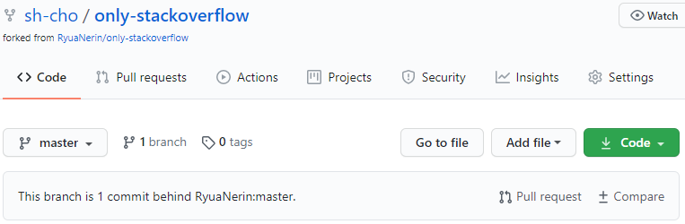 깃허브에서 한 리포지토리를 포크해놨는데 보니까 원본 리포지토리에 커밋이 추가돼서 제 master 브랜치가 원본 리포지토리보다 1 커밋 뒤에 있다고 나옵니다.