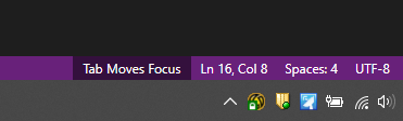 VS code 오른쪽 아래에 Tab Moves Focus라고 써있는데 Ctrl+M 단축키 눌러서 바꿔도 되고, 그냥 저거 클릭해도 토글이 됩니다.