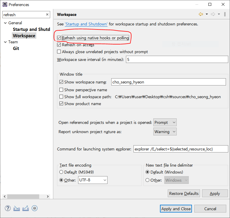 이클립스에서 만든 프로젝트 내 파일을 외부에서 수정하면 이클립스에서 적용이 자동으로 되지 않습니다. 그래서 직접 업데이트 해줘야 하는데 매우 귀찮으니 자동으로 업데이트 하도록 해줍시다.