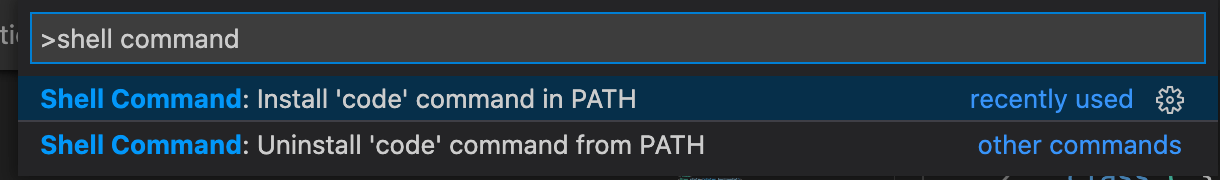Command + Shift + P > "Shell Command: Install 'code' command in PATH"를 선택하면 PATH에 비주얼 스튜디오 경로가 추가됩니다.