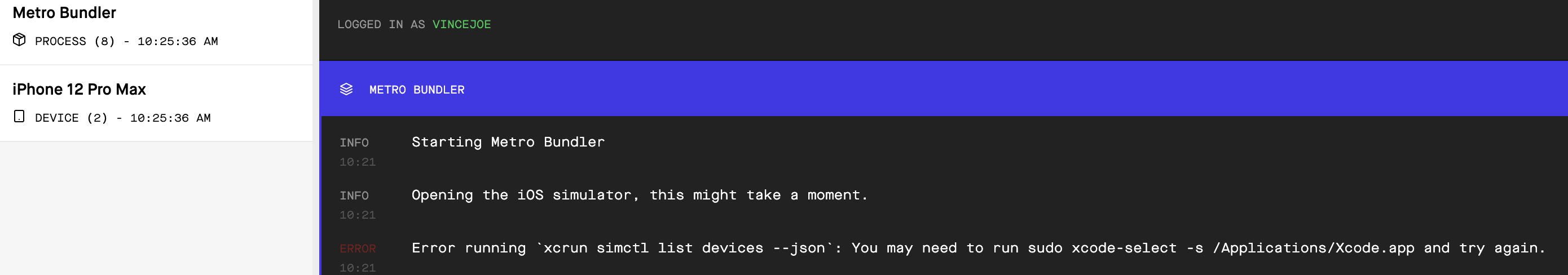 expo, Xcode를 설치하고 expo 앱을 실행시킨 뒤 "Run on iOS simulator"를 눌렀더니 위와 같은 에러가 나옵니다.